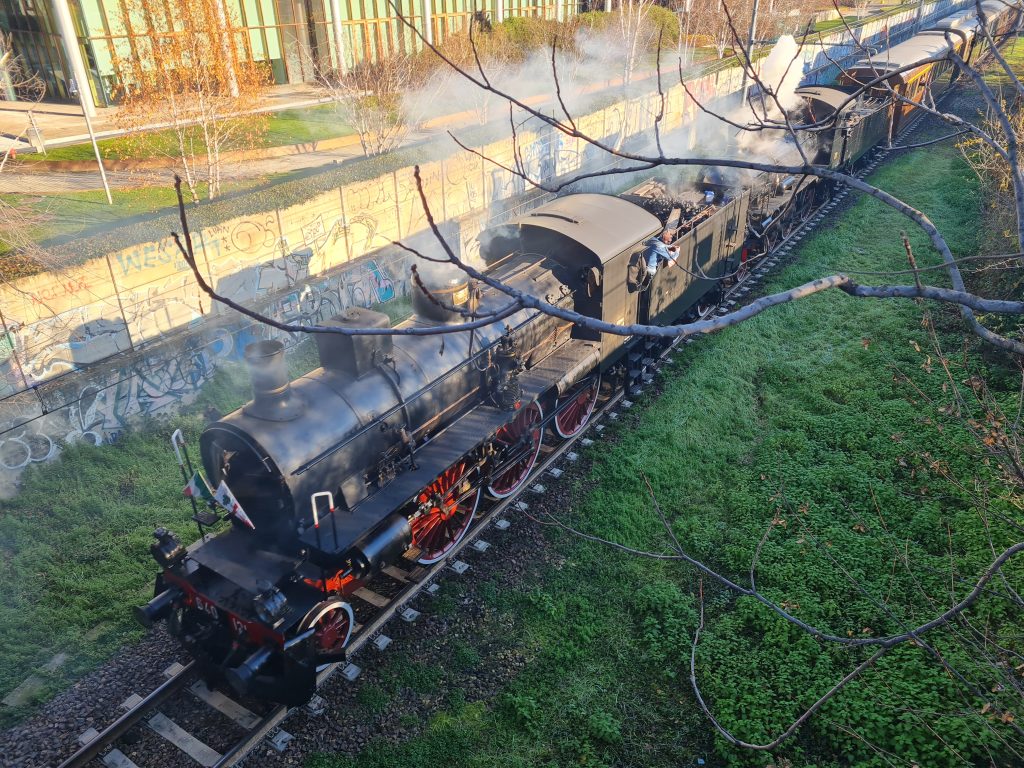 Per l’occasione è stato organizzato, ed era prevedibile, un treno storico a vapore. Questo era definito “in doppia trazione simmetrica”, cioè una locomotiva in testa ed una in coda. In effetti è partito la mattina dalla centrale per arrivare a S. Cristoforo con due locomotive a vapore in testa (per la cronaca: le 640.121 e 625.017) ed una elettrica (E636.161) in coda. Di solito i treni storici a vapore hanno al seguito una motrice moderna, elettrica o diesel che sia, ed è questa che svolge il vero lavoro di trazione: la locomotiva a vapore sta in testa a governare il freno, fumare e fischiare: insomma, a fare un po’ di scena per divertire gli appassionati. Qui invece la macchina elettrica, storica pure lei, aveva i pantografi abbassati: erano le due veterane a fare il loro dovere.