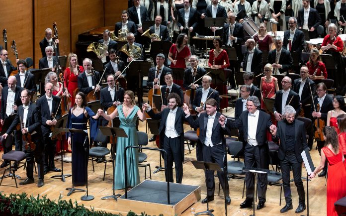 Un impianto esecutivo imponente, chiamato a misurarsi con una partitura che, completata da Beethoven nel marzo del 1824 ed eseguita per la prima volta il 7 maggio dello stesso anno a Vienna sotto la guida dell’autore, continua a interrogare interpreti e ascoltatori. I quattro movimenti canonici – Allegro ma non troppo, Molto vivace, Adagio moltoecantabile e il conclusivo Presto – sono stati affrontati con un’idea complessiva coerente, che ha privilegiato l’energia e la tensione drammatica, soprattutto nei momenti di maggiore densità sonora. Il finale, come prevedibile, resta il fulcro emotivo e spettacolare dell’intera Sinfonia: l’ingresso del coro e delle voci soliste produce un impatto non solo acustico ma anche visivo, che continua a esercitare un fascino diretto sul pubblico. Il quartetto vocale, formato dal soprano Benedetta Torre, dal mezzosoprano Dorottya Lang, dal tenore Davide Tuscano e dal baritono Günter Haumer, ha offerto una prova complessivamente convincente. Le voci maschili si sono distinte per chiarezza e solidità nei passaggi solistici, mentre le voci femminili hanno privilegiato un equilibrio d’insieme, mantenendosi sempre all’interno del tessuto corale, senza cercare protagonismi eccessivi, mettendo comunque in rilievo le eccellenti qualità timbriche.