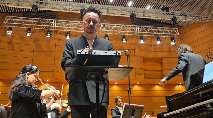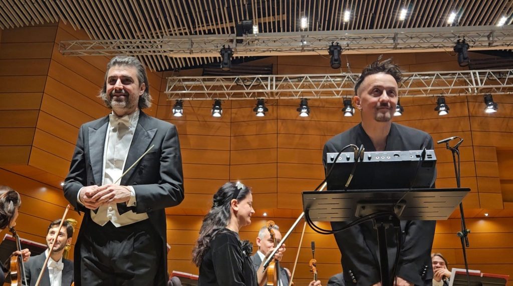Cadario ha introdotto questo ampio lavoro con una propria orchestrazione delle Cinq mélodies populaires grecques di Maurice Ravel, in un clima di finezza timbrica e misurata espressività: brani raffinati, orchestrati con grande cura e ben introduttivi rispetto al clima iniziale del lavoro di Dardust. Il Piano Concerto, con il compositore al pianoforte solista – in alcuni frangenti anche a una consolle per l’azionamento di inserzioni vocali “rapper” preregistrate – si è rivelato un lavoro decisamente interessante e convincente. I tre ampi movimenti, con relative suddivisioni interne, esprimono riferimenti musicali in ambito tonale che spaziano da Rachmaninov a Ravel, da Gershwin fino a Glass, senza tralasciare suggestioni di musica dal sapore antico. Il pianista-compositore ha trovato nella direzione di Cadario – interprete capace di muoversi con naturalezza dall’antico al contemporaneo – il sostegno ideale per una chiara progressione timbrica strumentale, in equilibrio con la più distesa e melodica componente pianistica. La molteplicità delle tematiche di questa composizione, a tratti dalle sembianze di un pastiche, trova una sua unità stilistica anche nelle genuine e brevi inserzioni rapper registrate, che conducono ai momenti musicalmente più concitati. Un brano decisamente piacevole, molto apprezzato dal pubblico presente.