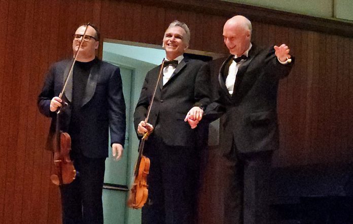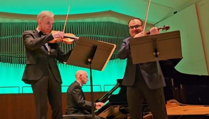 La medesima coesione si ritrovava nella corposa Sonata postuma del belga Eugène Ysaÿe, in tre ampi movimenti che valorizzano pienamente le possibilità timbriche dei due strumenti. Ysaÿe, oltre che compositore, fu grande virtuoso del violino, e ciò emerge chiaramente nella scrittura. Splendida anche in questo caso l’esecuzione. Dopo l’intervallo, un cambio completo di atmosfera coinvolgeva il pianoforte di Scott Wheeler. In apertura i Cinque pezzi per due violini e pianoforte di Dmitrij Šostakovič — Preludio, Gavotta, Elegia, Valzer e Polka — rivelano un volto diverso del compositore: una scrittura più leggera, discorsiva e immediatamente comunicativa, resa con nitore ed efficacia dal trio.