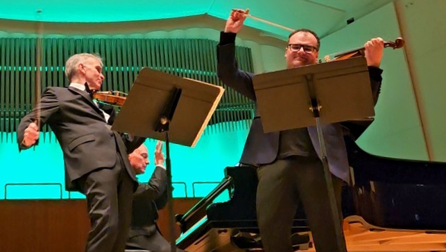 Il brano successivo, la Sonata per due violini e pianoforte, suite in cinque movimenti — in prima esecuzione milanese — denominata Borderlands, dello stesso Wheeler, oltre a essere eseguito con grande precisione, ha messo in luce le qualità dell’autore nel fondere stilemi tipicamente statunitensi, con richiami anche al jazz, al blues, al tango e al cakewalk sul piano ritmico e con notevole inventiva melodica. Bravissimi i due violinisti, in perfetta sintonia, sostenuti dalle eleganti armonizzazioni dello stesso Wheeler. Di qualità anche Navarra op. 33 di Pablo de Sarasate, che ha concluso il programma con brillantezza. Rilevante il bis con l’Allegro moderato dalla Suite op. 71 di Moritz Moszkowski. Applausi calorosi.