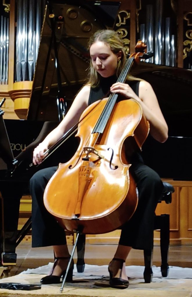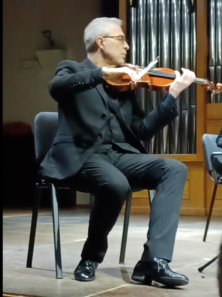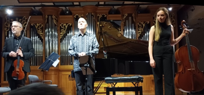 Sul palcoscenico un Trio, formatosi per l’occasione, composto da Marco Bronzi, violino, Christiana Coppola, violoncello e Simone Pedroni, pianoforte. Di M. Bronzi è inutile qui una presentazione, data la sua fama internazionale ormai consolidata, che lo vede tra i migliori violinisti italiani della generazione dei ’70; lo stesso vale naturalmente per S. Pedroni, salvo il dovere di ricordare che il cinquasettenne pianista novarese è l’unico pianista italiano ad aver vinto la Gold Medal al mitico concorso Van Cliburn, nel 1993, e che da una decina d’anni va affiancando la sua attività pianistica a esperienze di direttore d’orchestra, ottenendo buon successo soprattutto con la musica per il cinema:  Rota, Morricone, Williams i suoi autori preferiti. Insegna attualmente al Conservatorio di Novara.Qualcosa di più dobbiamo dire della giovane (n.2004) violoncellista Christiana Coppola.