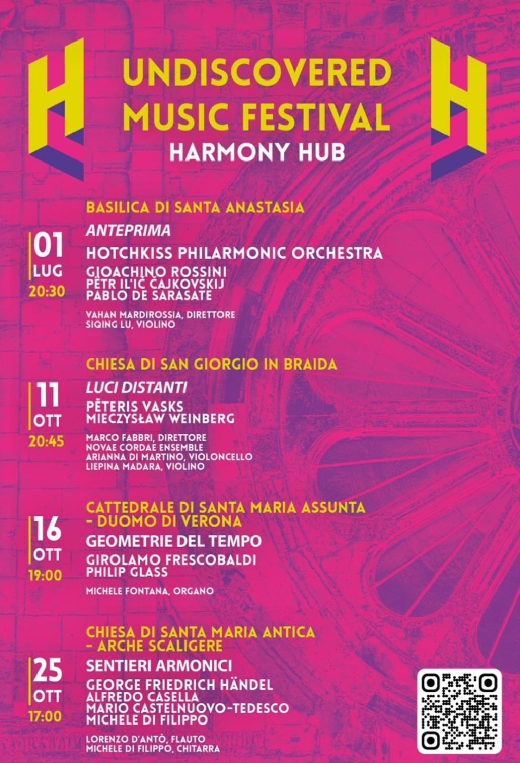 giunto alla Seconda Edizione, presenterà concerti incentrati sulla musica strumentale del Novecento, con inserti di composizioni che travalicano i secoli, attraverso connessioni tra musiche più antiche e la contemporaneità; nella Seconda Edizione L’ Undiscovered Music Festival ospiterà il gruppo Novae Cordae Ensemble, un’orchestra da camera che si cimenterà nell’esecuzione di opere di Vasks e Weinberg, musicisti assai poco eseguiti in Italia. Il Festival proseguirà con concerti che vedranno esibirsi artisti come Lorenzo D’Antò, primo flauto dell’Orchestra Arena di Verona e l’organista veronese Michele Fontana. L’obiettivo del Festival è coinvolgere un pubblico giovane nel mondo della musica d’arte. Il Festival può vantare la media partnership di Rai Radio 3 e il patrocinio della Santa Sede per il Giubileo 2025: le ambientazioni veronesi coinvolgono infatti alcune Basiliche di grande bellezza e fascino: dopo l’anteprima in Basilica di Sant’Anastasia a luglio, le sedi che ospiteranno il Festival 2025 sono se possibile ancora più prestigiose: si aprirà il giorno 11 ottobre nella Chiesa di San Giorgio in Braida, per proseguire nella splendida Cattedrale di Santa Maria Assunta (16 ottobre) e chiudere il 25 nella scenografica Chiesa di Santa Maria Antica alle Arche Scaligere.