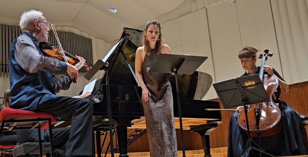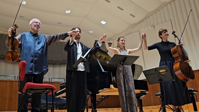 Il momento centrale del concerto era dedicato a Dmitrij Šostakovič, con una rarità come le Sette romanze su poesie di Alexandr Blok op. 127, per soprano e trio. Qui la voce di Anna-Lena Elbert si è intrecciata di volta in volta con i singoli strumenti e con l’ensemble nel suo complesso, fino all’ultima romanza, Muzika, in cui tutti e quattro gli interpreti si riuniscono. Le composizioni, scritte nel 1967, rivelano il tratto tipico dell’ultimo Šostakovič: una scrittura di profonda espressività, attraversata da forti contrasti timbrici e da una drammaticità evidente, come nell’intenso Burja (Tempesta) per soprano, violoncello e pianoforte.