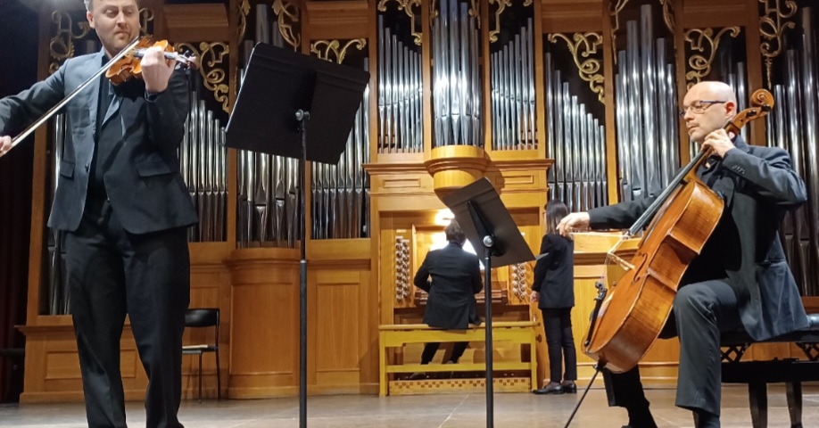 I Concerti del sabato, organizzati dal Conservatorio Cantelli di Novara, hanno inaugurato il 2026 nel pomeriggio del 10 gennaio, con un concerto che ha avuto come strumento protagonista l’organo in ruolo solistico e in trio con violino e violoncello. A suonarlo è stato chiamato Massimo Gabba (n.1973), assai noto per la sua intensa attività concertistica, con la partecipazione ai più importanti festival d’organo internazionali, nonché per il gran numero d’incisioni discografiche, soprattutto di autori dell’età romantica, di cui è considerato uno specialista in Italia. Attualmente è docente di organo presso il Conservatorio Cantelli di Novara. L’impaginato del concerto prevedeva due brani, il primo dei quali era il Preludio e Fuga in la minore BWV 543, di J. S. Bach. Il valore d’interprete di Gabba è risaltato già nella sezione toccatistica del pezzo, ove, nella impeccabile gestione delle due tastiere, della pedaliera e dei registri, sono esaltati il vario gioco degli arpeggi iniziali della mano destra, l’incalzarsi degli arabeschi in cui si trasforma il tema principale e il flusso melodico, quasi motus perpetuus, che ne scaturisce.