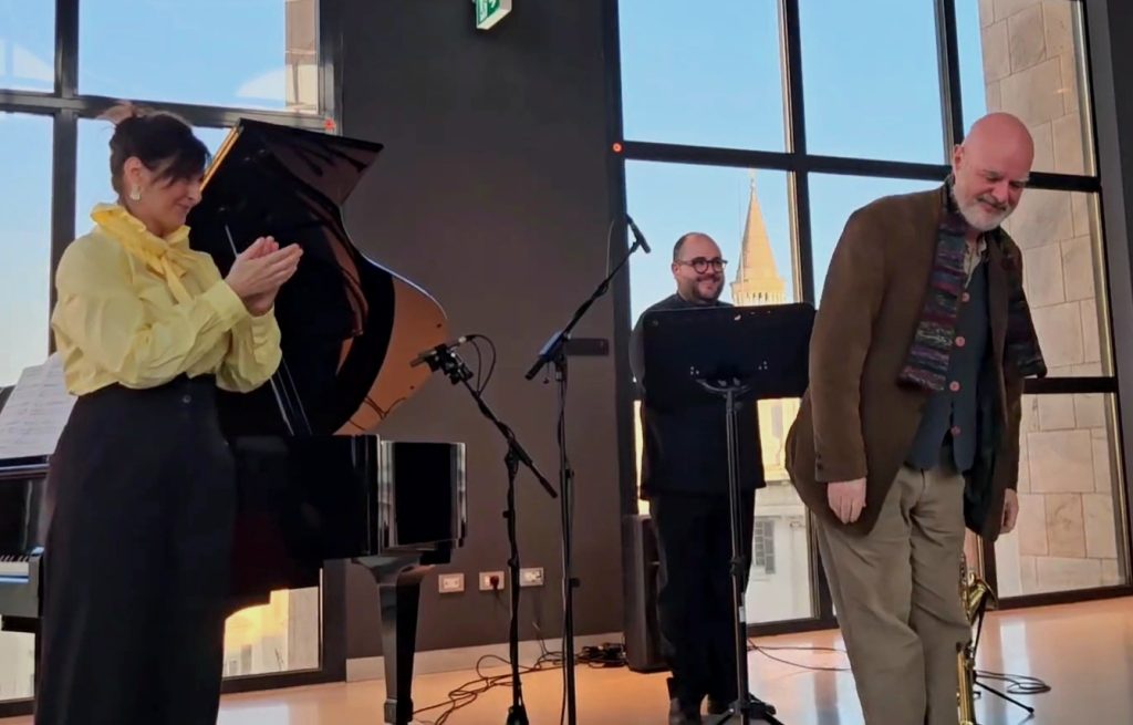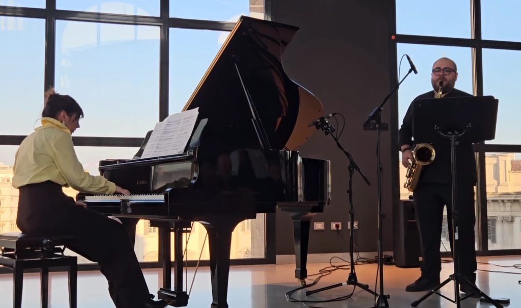 Il primo brano, Le désaccordé Stockhauslein (2026) di Alessandro Polito, scritto per l’occasione e proposto in prima esecuzione assoluta, si è rivelato un lavoro interessante, giocato su sottili situazioni di riverbero tra le poche note del pianoforte e quelle del sax alto: un dialogo tenue, attraversato da momenti più effervescenti nei registri acuti. Un esito convincente, salutato da applausi per il compositore e gli interpreti.