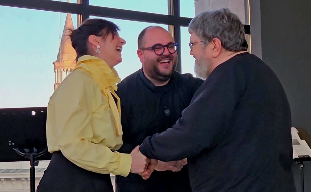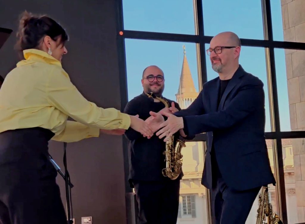 L’ultimo lavoro in programma, Flori et herba (1997) di Carlo Boccadoro, si muove tra linguaggi diversi ma accessibili, grazie a una complessiva cantabilità. Le armonie pianistiche ripetute, che evocano tratti del minimalismo, si intrecciano con le note lunghe del sax soprano, dando vita a una scrittura ricca di suggestioni quasi pittoriche. Un brano ampio nelle dimensioni, capace di stabilire un’immediata presa sull’ascolto. Applausi fragorosi anche per il compositore,