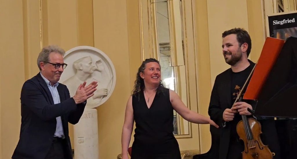 L’ultimo brano, Ariette quasi retrouvée, sempre di Gervasoni, del 2026 e in prima esecuzione assoluta, è apparso come un lavoro breve ma decisamente vario e ricco di situazioni. I numerosi contrasti, sia dinamici sia di carattere, lo rendono interessante e ben costruito. Ancora una volta precisa, attenta ed espressiva l’interpretazione del duo, accolta da applausi calorosissimi, condivisi con il compositore, visibilmente soddisfatto.