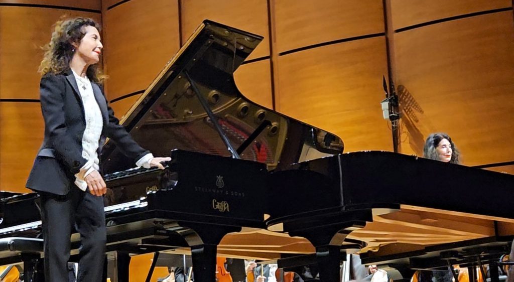 Si trattava dunque di un contrasto netto tra i lavori importantissimi di due geni del repertorio classico-romantico e un brano recente, interessante e piacevole, ben costruito, che ha riscosso un successo sorprendente. Glass, anche in questa composizione articolata in tre movimenti (senza indicazione di tempo), impiega le sue strategie tipiche del minimalismo: una ripetizione tematica insistita, con variazioni sottili e articolate in un contesto armonico e ritmico in continuo mutamento. La linearità dei temi, pur entro una struttura stratificata e complessa, ha saputo coinvolgere il pubblico. Katia e Marielle Labèque, forti della loro lunga esperienza in questo repertorio, hanno mostrato un’ottima intesa reciproca e con l’orchestra, ben coordinata dal direttore. Molto apprezzato anche il bis concesso per due pianoforti, ancora di Glass — da Four Movements (2018) la parte finale.