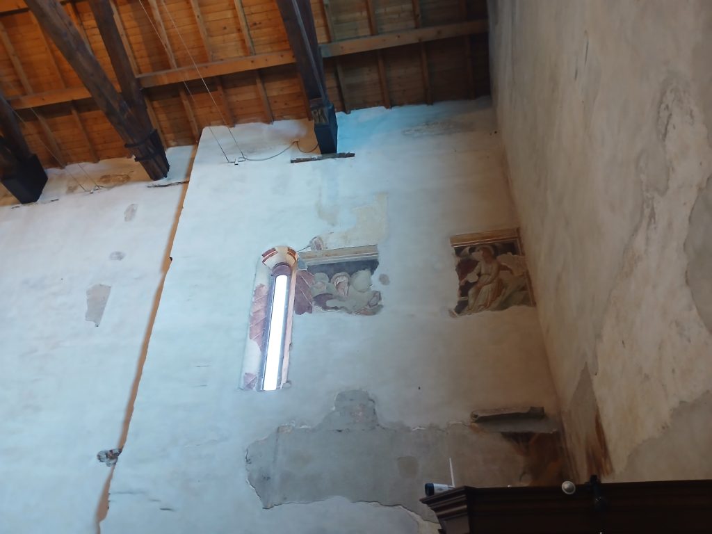 All’interno, a navata singola, gli affreschi trecenteschi dell’abside, delle pareti e della controfacciata risultano gravemente danneggiati – anche a causa di restauri sbagliati negli anni ‘50 – e in maggioranza poco visibili. È un vero peccato, perché in parte erano di scuola giottesca, quindi particolarmente preziosi.