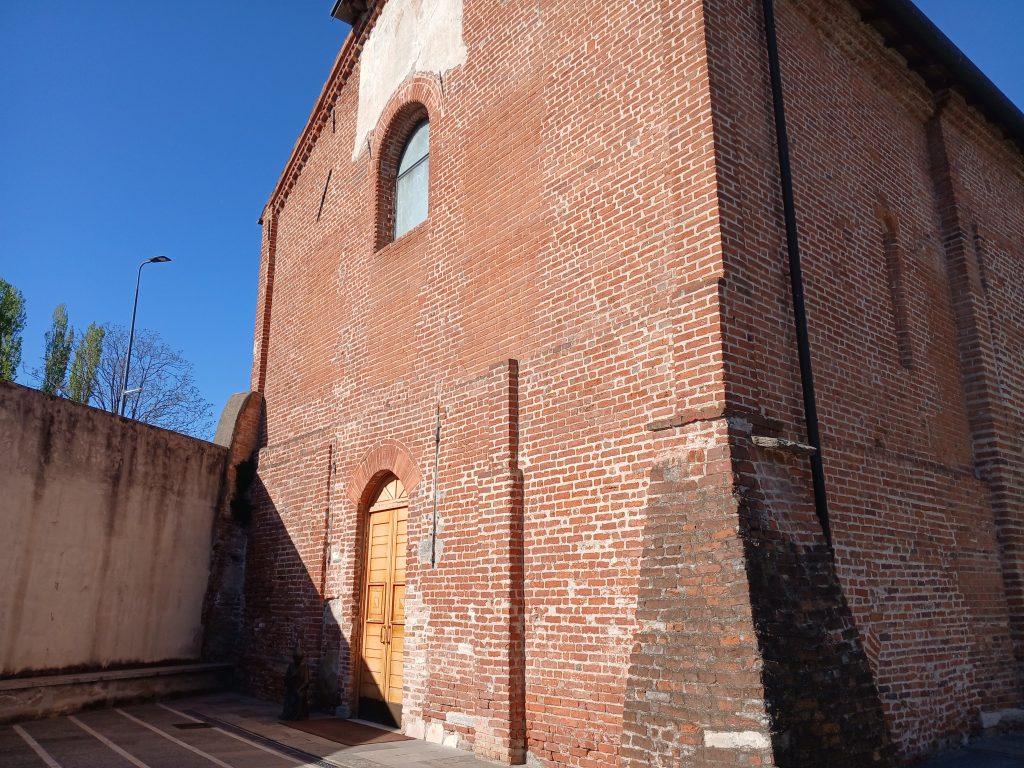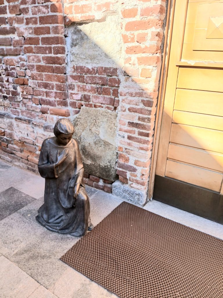 La si potrebbe migliorare ricoprendola completamente con un rampicante come edera o vite del Canada; e perché non pensare anche a ingentilire il tutto con piante fiorite, alla base del muro, togliendo le piastrelle della pavimentazione e creando una striscia di terreno adatta? A fianco del portone una statua in bronzo mostra una figura femminile inginocchiata in atteggiamento di preghiera, e sembra proprio chiedere a tutti di conservare e abbellire questo luogo, testimone di pietra di secoli di storia milanese.