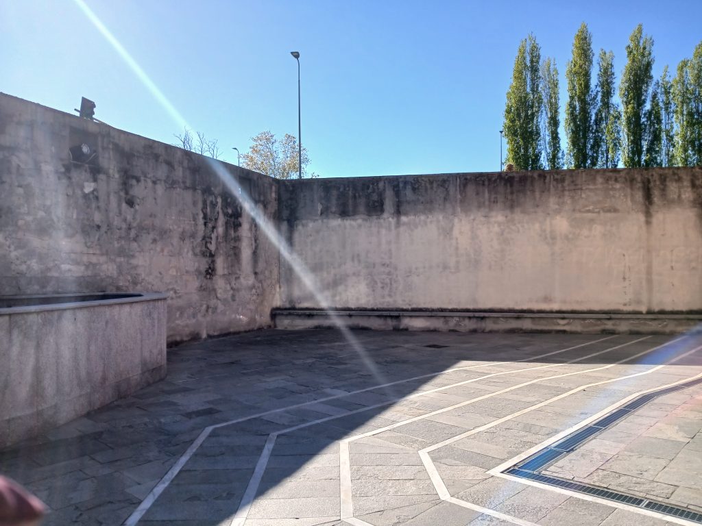 Purtroppo, sul lato sinistro della facciata è stato unito un alto muro di cemento, verso la strada, che prosegue fino al cancello d’ingresso e serve da appoggio a una fontana, pure circondata da un muro che quasi impedisce di vedere l’acqua al suo interno. L’insieme è più simile a una muraglia grigia piuttosto squallida, esteticamente fastidiosa.