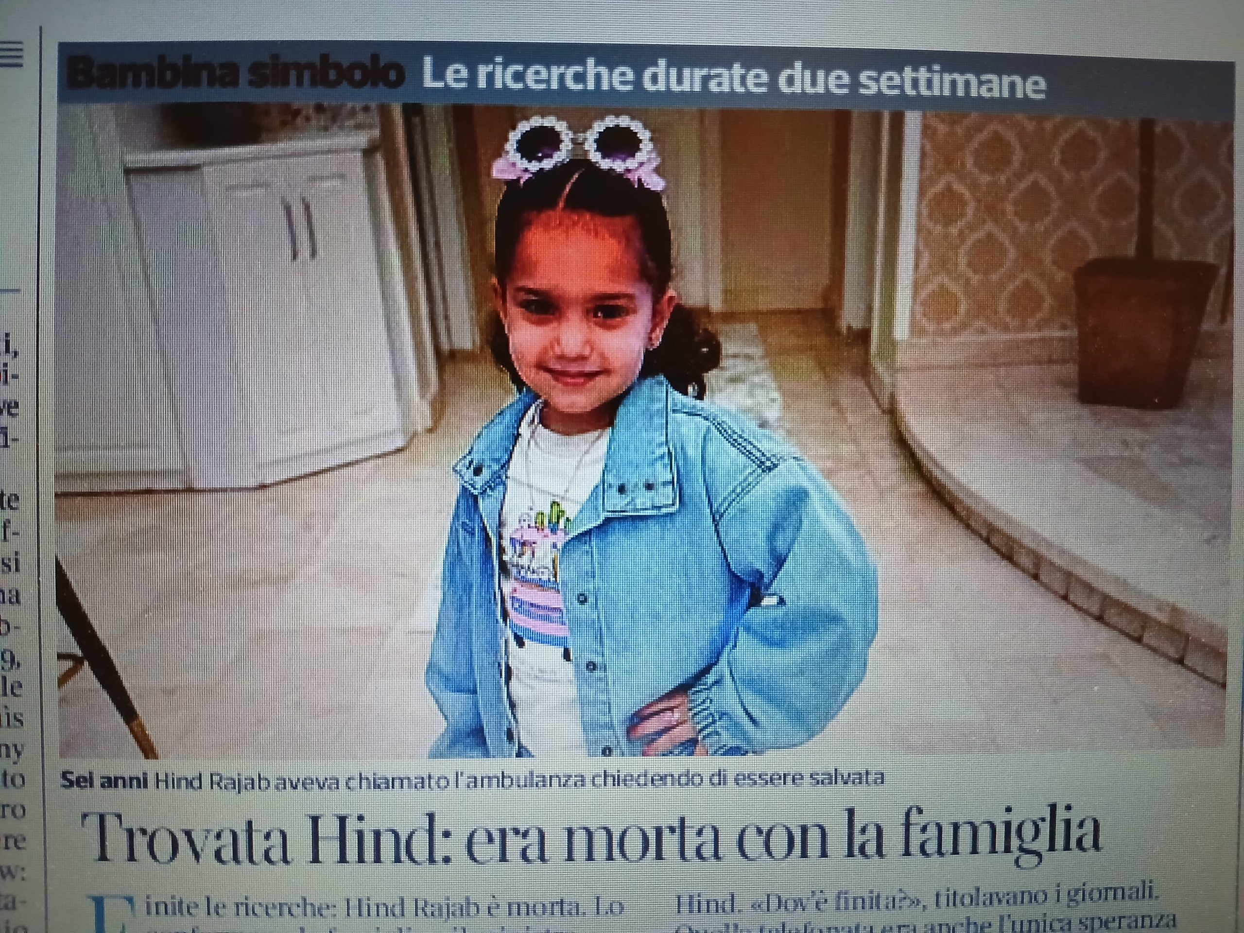 In un’altra istantanea, indossa un giubbottino jeans, ha un’aria scanzonata, con occhiali da sole giganti dalla montatura a forma di margherita. Ma Hind non c’è più dal 29 gennaio 2024. La sua brevissima vita è stata interrotta brutalmente da criminali assassini vestiti da soldati che, nascosti dentro carri armati o dietro muri in rovina, da ormai due anni sparano nelle strade di Gaza e uccidono con ferocia disumana persone disarmate e indifese, senza nessuna pietà, neppure per i bambini. Il corpo della piccola Hind è stato ritrovato quasi due settimane dopo quel lunedì di fine gennaio, all’indomani del ritiro delle truppe israeliane dalla zona, in un’automobile crivellata di colpi, tra i cadaveri degli zii e di tre cuginetti. A breve distanza, un’ambulanza della Mezzaluna Rossa, o meglio quello che ne restava dopo essere stata barbaramente colpita dalla cannonata di un carro armato: i suoi occupanti – entrambi fatti a pezzi – erano due paramedici che cercavano di raggiungere Hind per salvarla.