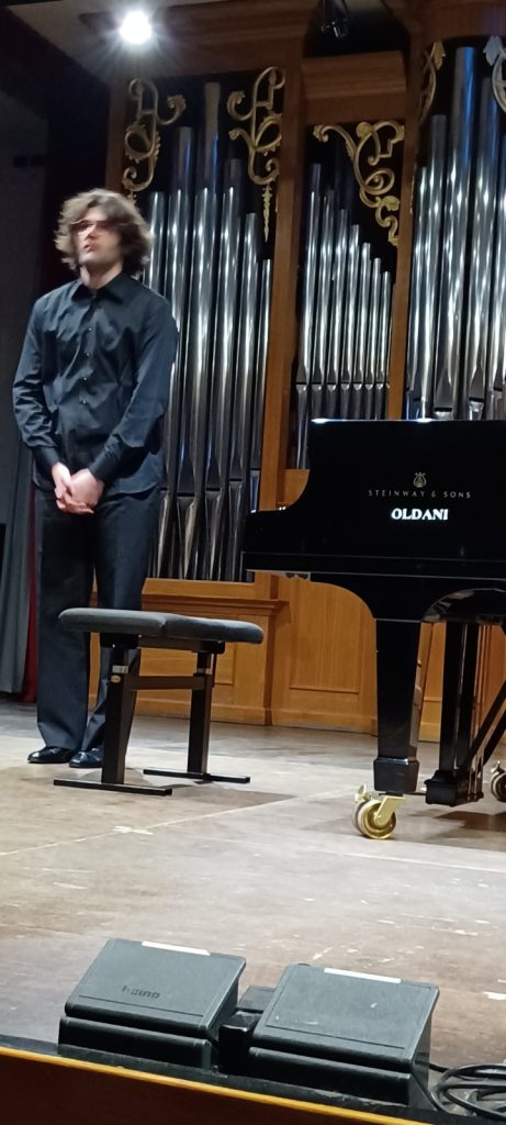 Gli Etudes Tableux scelti per l’impaginato del recital erano il n.1 in si minore, n.2 in do maggiore, n.5 in re minore, n.7 in mi bemolle maggiore, n.8 in sol minore, n.9 in do# minore, sei miniature, ciascuna con uno “spunto “visivo” o emotivo, con un percorso variegato. Con una scelta curiosa, questi pezzi sono stati suonati non tutti quanti di fila, ma i primi quattro prima, gli ultimi due dopo la Sonata di Medtner. Senza ovviamente entrare in analisi particolari dei singoli pezzi, dopo avere indicato quello che secondo noi è il limite attuale di Sacconi, che, siamo certi, maturando, riuscirà a correggere, indichiamo le qualità esecutive che più abbiamo apprezzato in questo suo Rachmaninov: la padronanza tecnica della diteggiatura in velocità e nei passaggi di grande densità ritmico-armonica, con ammirevole virtuosismo, (esemplare il n.7) e, nei numeri di più intensa carica drammatica, come il n.9, una tensione che sa esplodere in modo coinvolgente per l’ascoltatore.