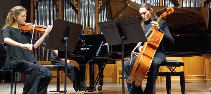 La Sonata tragica di Medtner, in un unico tempo, è un pezzo non molto frequentato del repertorio pianistico e perciò siamo grati a Sacconi di avercela proposta all’ascolto. Scritta negli anni immediatamente successivi alla Rivoluzione dell’ottobre 1917, da cui Medtner, come Rachmaninov, fuggì, è una pagina di scrittura intensa, densa, che riflette un mondo interiore fortemente segnato da contrasti e da un tragico senso del destino. Stilisticamente si caratterizza per elaborazioni contrappuntistiche di grande complessità, e sul piano espressivo oscilla tra momenti di tensione tragica venata di fremiti eroici e momenti di distensione cantabile. Affrontando questa sonata Sacconi ha dato naturalmente il meglio di sé nelle sezioni agogicamente più concitate, dimostrando anche una tensione espressiva di notevole impatto, mentre nelle sezioni più ‘riflessive’ e liriche, l’elemento cantabile è un po’ evaporato. Il pubblico è rimasto colpito dal virtuosismo davvero notevole di Sacconi tributandogli applausi vicini all’ovazione, che hanno strappato un ‘fuori programma’: tanto per non varcare i confini dell’Impero russo, uno Studio di Skrjabin: un ulteriore sfoggio di perizia tecnica e focosa energia di suono. Di Beethoven, nella seconda parte del concerto è stata eseguita una delle primissime opere del suo catalogo, il Trio op 1 n.3 in do minore. La compagine chiamata ad eseguirlo era composta da Valeria Di Crosta (violino): sebbene di formazione milanese, al Conservatorio Verdi, da qualche tempo partecipa ad attività artistiche promosse dal Cantelli; Luisa Dal Molin al violoncello e Koharu Tamura al pianoforte, entrambe impegnate in un percorso di formazione al Conservatorio novarese. A differenza dei due precedenti trii dell’op. 1, questo in do minore, in quattro tempi, si distingue per l’intensità espressiva e l’equilibrio dialogico fra i tre strumenti — caratteristiche che già preannunciano il Beethoven più maturo. Un aspetto spesso delicato nei trii beethoveniani — dove Beethoven, a differenza di altri compositori dell’epoca, attribuisce ruoli paritari a tutti gli strumenti invece che relegare violino e violoncello a ruoli accompagnatori — è proprio il dialogo continuo tra le parti. Nel complesso, l’esecuzione rivela una buona comprensione di questo principio: i tre interpreti cercano costantemente un equilibrio dialogico. Tuttavia, in questo dialogo, ci è parso abbia incontrato qualche difficoltà il violino. Di Crosta è impeccabile nell’intonazione, negli attacchi, nel fraseggio, nelle arcate, ma ha una cavata piuttosto debole, di fragile proiezione, che viene fatalmente ’coperta’ in particolare nei momenti in cui a suonare sono tutti e tre gli strumenti, su dinamiche ‘forti’. Nel complesso, al netto da questo rilievo, l’interpretazione fornita da Di Crosta, Dal Molin e Tamura è stata espressivamente e stilisticamente coerente, presentando un Beethoven di luminosa bellezza ancora settecentesca: decisivo, in questo esito interpretativo il contribuito del violoncello di Dal Molin, con la sua elegante fluidità e, soprattutto, il pianoforte di Tamura, magnifico per la brillante chiarezza del suono, con note sgranate come perle di soave lucentezza e un fraseggio sempre trasparente e preciso, anche nei passaggi in velocità e negli abbellimenti. Degna di apprezzamento anche l’attenzione al colore, con una linea espressiva coerentemente virata su una vena emotiva delicata. Nel complesso, una esecuzione piacevole, che il numeroso pubblico ha mostrato di aver gradito con applausi convinti. Non è stato concesso nessun bis. Non possiamo che esprimere, da parte nostra, il più vivo apprezzamento per giovani di talento molto ben preparati dal punto di vista della tecnica dei rispettivi strumenti, che naturalmente devono ancora raggiungere una piena maturità interpretativa, ma sanno già offrire al pubblico un pomeriggio di buona musica.