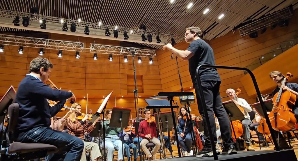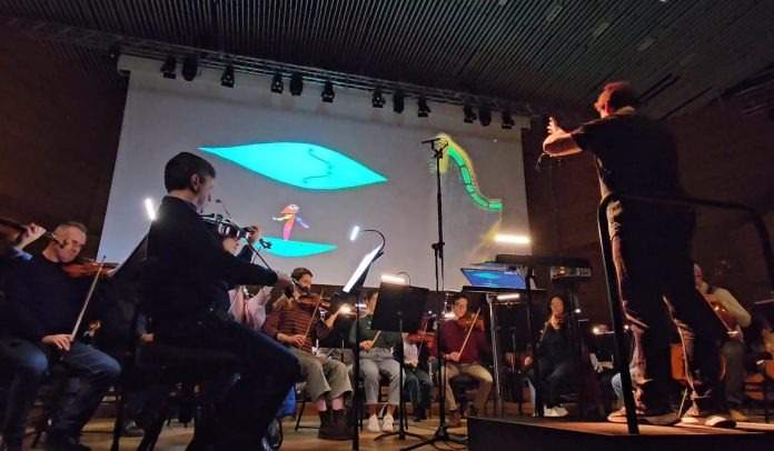 Il programma è proseguito con Mothership, proposto in prima esecuzione italiana. Il brano immagina una sorta di “astronave musicale” capace di accogliere e far interagire diversi solisti dell’orchestra, creando un ambiente sonoro in cui elementi elettronici e scrittura sinfonica convivono in modo fluido. In una posizione più elevata, alla consolle elettronica, era presente lo stesso Bates. Il programma si è concluso con Philharmonia Fantastique: The Making of the Orchestra, anch’essa in prima esecuzione italiana. Si tratta di uno spettacolo multimediale concepito da Mason Bates insieme al sound designer Gary Rydstrom, con animazioni curate da Jim Capobianco.
