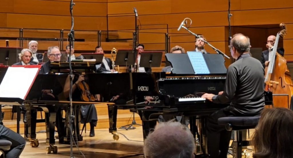 L’entrata dell’orchestra per il noto Concerto per due pianoforti e orchestra n. 10 K. 365 ha suggellato l’alto livello della serata. È un concerto nei classici tre movimenti – Allegro, Andante e Rondò – tra i più celebri per l’orecchiabilità dei temi -trattati in perfetta alternanza dal duo pianistico- e per l’equilibrio costruttivo tra i pianoforti e gli strumenti. Il ritorno al solo duo pianistico prevedeva un lavoro di Ferruccio Busoni il Duettino concertante legato al finale del Concerto K. 459 di Mozart: una serie di rimandi al tema, ricco di variazioni, che i due interpreti hanno esposto intrecciandosi in modo raffinato ed ancora in perfetto equilibrio.