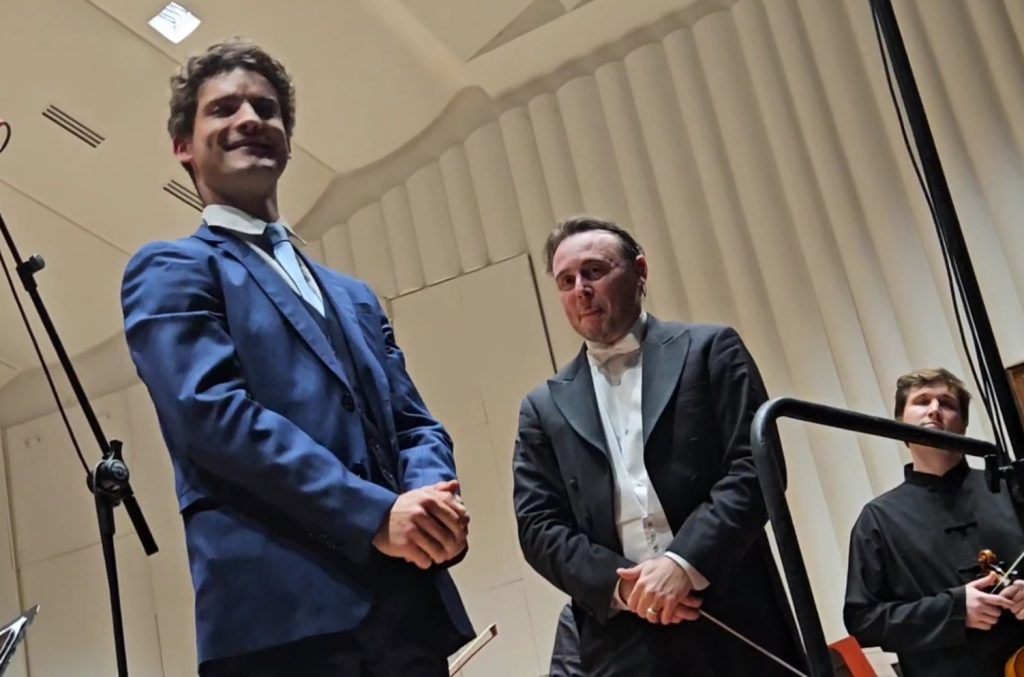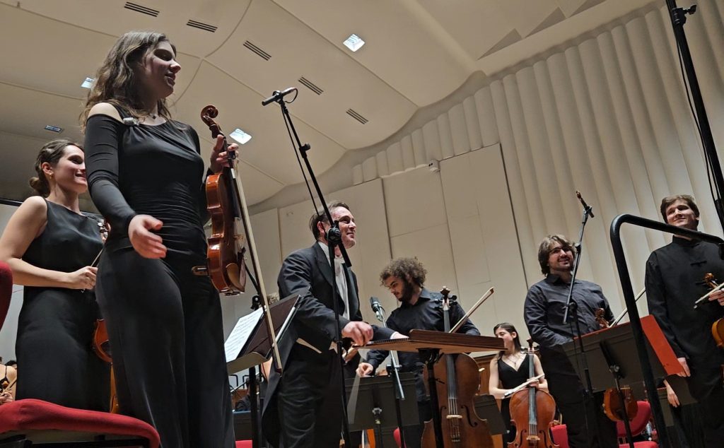 Il successivo brano di Filippo Lepre, vincitore del Premio di Composizione del Conservatorio 2025 (Premio di Composizione Umberto Micheli), ha introdotto una prospettiva contemporanea. Il titolo del lavoro, “Ho lanciato un sasso nell’acqua e ne ho seguito le increspature con lo sguardo“, si è sviluppato come una riflessione sul suono e sulla sua propagazione, giocata su una serie di effetti, variazioni timbriche e su un’attenzione quasi cameristica ai dettagli. Un brano particolarmente ricco di suggestioni, che rivela una valida coerenza musicale, ben organizzata e restituita con precisione dai bravissimi strumentisti, i quali hanno affrontato la scrittura con concentrazione, restituendone la fine trama di risonanze e sospensioni. Ottimo lavoro e fragorosi applausi al compositore, salito sul palcoscenico della Sala Verdi.