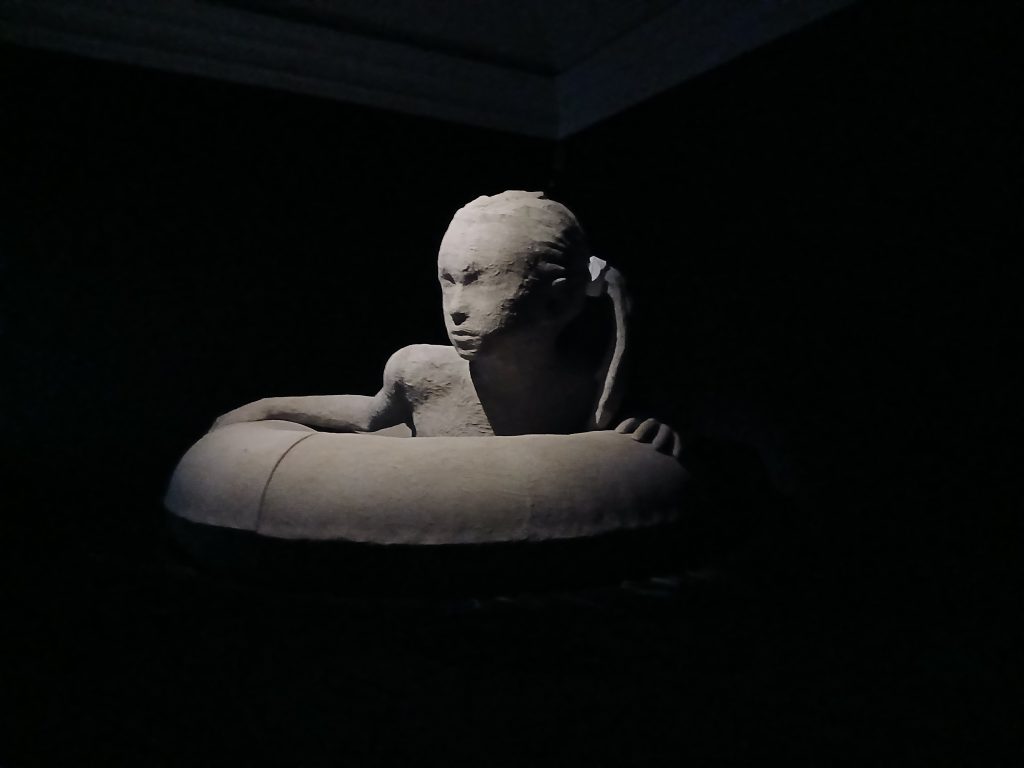 A Safe Place (2025), all’inizio del percorso espositivo, è un’installazione che mostra una bambina in un salvagente, in una camera buia: la luce che la colpisce fa sì che sembri galleggiare. Ma non è un momento felice di una vacanza balneare. Rappresenta invece l’infanzia tragicamente coinvolta nei flussi di migranti, la cui vita è spesso perduta in naufragi di barconi nel Mediterraneo. La colonna sonora della sala, molto coinvolgente, è stata composta da Lucio Disarò, da anni collaboratore di Berruti.