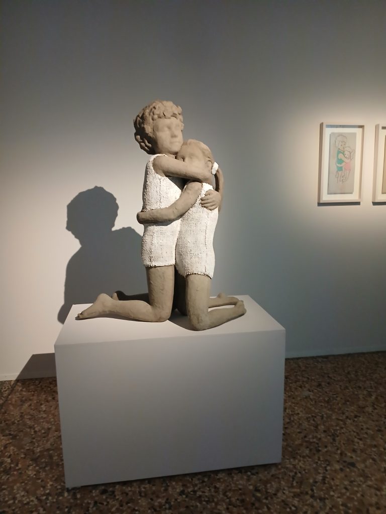 Del 2020 è L’abbraccio più forte, scultura in cemento, resina e juta, associata a disegni su cartoncino e a un video costituito da 776 disegni in sequenza. I disegni furono venduti per finanziare la costruzione dell’ospedale di Verduno, vicino ad Alba. Ed ecco che l’abbraccio per Berruti diventa reale e universale, non solo metaforico e artistico.