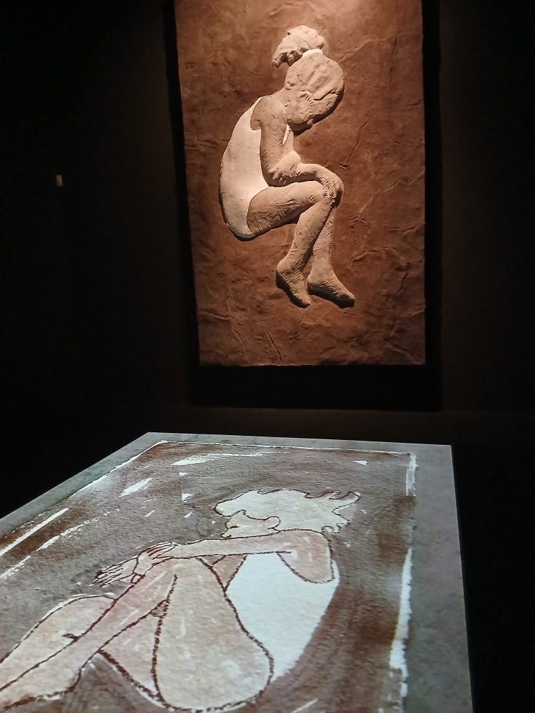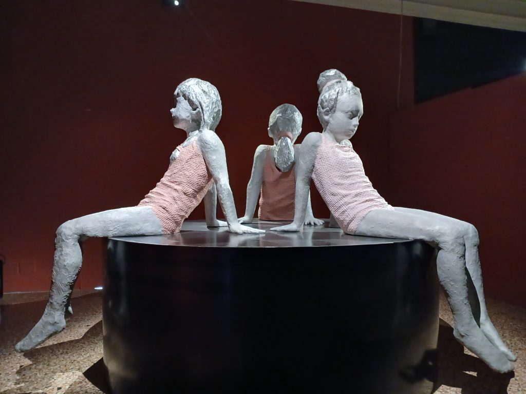 Tre bambine con un costumino rosa e pettinature diverse, sedute in cerchio ma di spalle, non interagenti, costituiscono l’opera Three (parts of) me (2025): in realtà quindi è la stessa bimba, triplicata nelle sue diverse personalità, una pubblica più conforme alle norme della società, una più privata e famigliare e infine una segreta e nascosta, la vera essenza. Tre “maschere”, dunque, che la tradizione giapponese vuole che valgano per ognuno di noi.