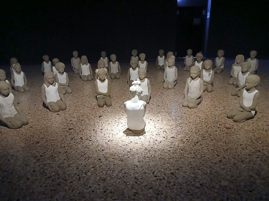 Magnifica l’installazione Nel nome del padre (2024): si entra in una stanza buia con una quarantina di bambini e bambine seduti, quasi inginocchiati, in costumi bianchi, illuminati da una luce soffusa: disposti come in un anfiteatro, sono tutti rivolti verso una figura centrale, una bambina con i capelli raccolti e il volto chino. Nessuno sorride, sembrano in meditazione, più filosofica che religiosa. E in effetti l’opera suscita una riflessione su tutti i bambini del mondo, su quell’universo infantile che assiste impotente alle guerre, all’indifferenza degli adulti, o peggio alla loro violenza di cui sono spesso vittime innocenti, e si pone domande senza risposte. Tra queste, la stessa domanda che dovrebbe porsi ognuno di noi: perché?