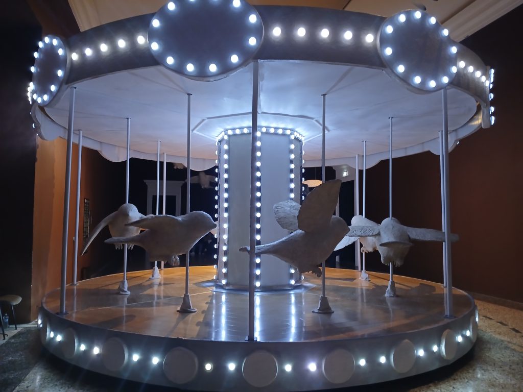 Nell’ultima sala, La Giostra di Nina (2018), dove i visitatori possono salire, aiutati da un gentilissimo addetto. Al posto dei cavallini, enormi passeri; il carillon è musica composta appositamente da Ludovico Einaudi. Le giostre, che attirano da sempre bambini (ma anche adulti), non sono altro che magici simboli del ciclo della vita, ma anche del moto della Terra e dei pianeti intorno al Sole, dello scorrere del tempo. Si partecipa dunque a un viaggio – in questo caso a un volo – senza inizio e senza fine. I passeri, che nella cultura greca e romana erano spesso associati a manifestazioni divine, sono liberi. Alcuni volano in cielo, verso il soffitto della sala. Un cortometraggio animato è abbinato all’installazione. È un invito a sognare, a tornare bambini, a riprendere a pensare in modo puro e innocente.
