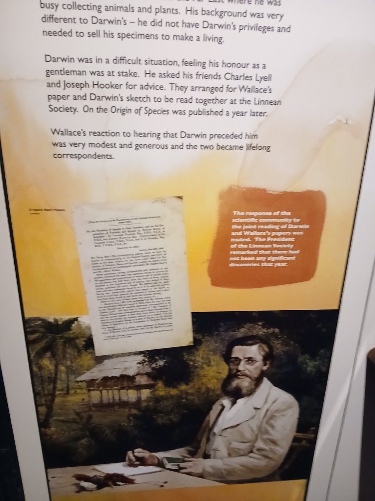 Un doveroso omaggio ad Alfred Russell Wallace, che in Indonesia era giunto indipendentemente alle stesse conclusioni di Darwin, con cui era in corrispondenza, è in evidenza su una parete.