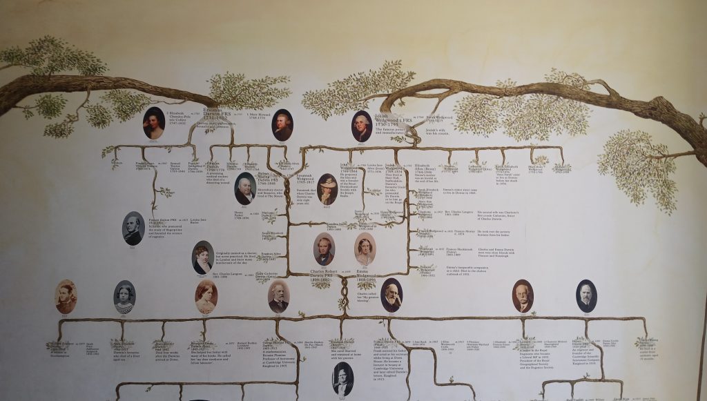 Sopra il camino, sono appesi i ritratti del geologo Charles Lyell e del botanico Joseph D. Hooker, grandi studiosi, entrambi amici di Darwin, oltre a quello del nonno di Charles ed Emma, Josiah Wedgwood, ceramista: uno dei più importanti esponenti della prima rivoluzione industriale, nonché uno dei primi a chiedere l’abolizione della schiavitù. La figlia Susannah era la madre di Charles, il figlio Josiah junior era il padre di Emma. Non si può inoltre dimenticare, pur mancando il ritratto, il nonno paterno di Darwin, Erasmus: medico, padre di ben quattordici figli (tra cui Robert, il padre di Charles) da tre donne diverse, fu l’autore di Zoonomia, che si avvaleva di idee trasformiste ed ebbe molto successo.