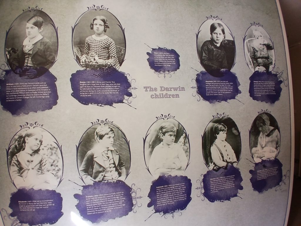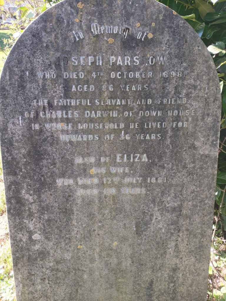 Qui abitò con la moglie – la cugina Emma Wedgwood, sposata nel 1839 – e i loro dieci figli, insieme a pochi domestici. Il nome di uno di questi, il maggiordomo Joseph Parslow, “servo fedele e amico di Charles Darwin”, è inciso su una pietra tombale, vicino a quella di alcuni figli di Darwin, nel piccolo cimitero di Downe, il villaggio del Kent dove i coniugi Darwin si trasferirono da Londra.