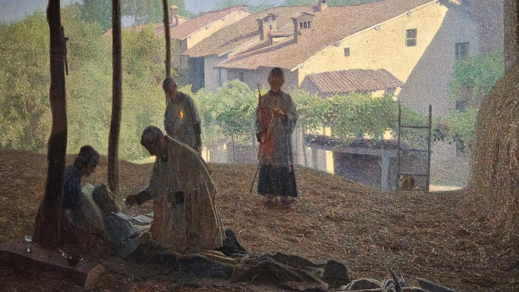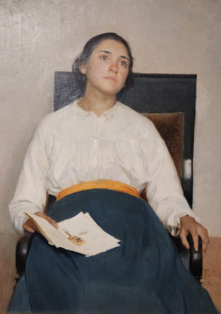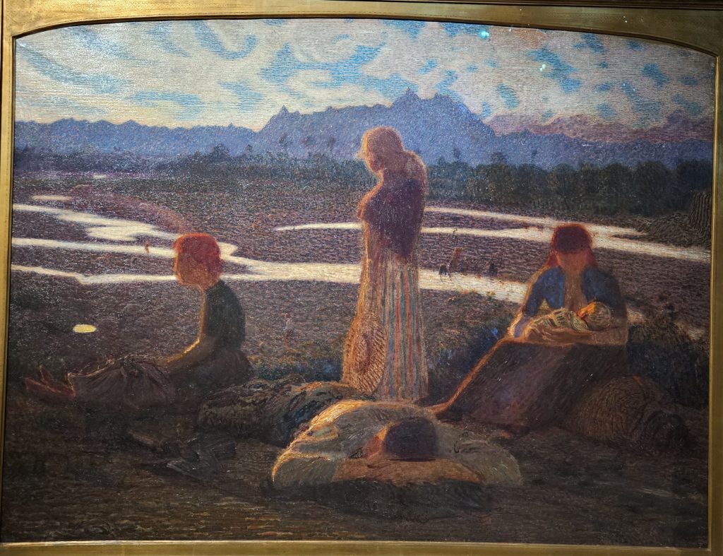 A Giuseppe Pellizza (1868 – 1907) è stata dedicata una bellissima mostra monografica al GAM (fino al 25 gennaio 2026): nelle sale al pianterreno sono esposti una quarantina di dipinti e disegni, dalle prime opere del pittore ventenne fino alle ultime, di poco precedenti la sua tragica morte. Una forte crisi depressiva che lo colse a seguito della scomparsa della sua amatissima Teresa, sua ex modella, sposata nel 1892 e spirata dopo aver dato alla luce il piccolo Pietro, terzogenito, morto neonato – lo portò, nella notte tra il 13 e il 14 giugno 1907, a impiccarsi a una scala, nel suo studio.