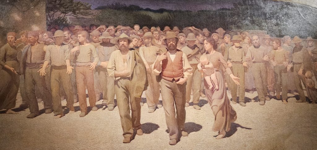 Al primo piano del GAM il suo capolavoro, il quadro più famoso, che all’inizio non aveva ricevuto il meritato successo: Il quarto stato (1901), che fu preceduto da Ambasciatori della fame (1892) e Fiumana (1896). Grande tela, vera icona rivoluzionaria del Novecento e quasi manifesto politico, rappresenta le istanze e le proteste popolari a favore di un socialismo umanitario. Il padre Pietro era un convinto garibaldino, impegnato nella locale Società di Mutuo Soccorso, e Giuseppe aveva respirato fin da bambino un’aria risorgimentale impregnata di generosi ideali e legata a questioni contadine e operaie. A Pellizza fu proposto dai socialisti di candidarsi alle elezioni politiche, ma non accettò.