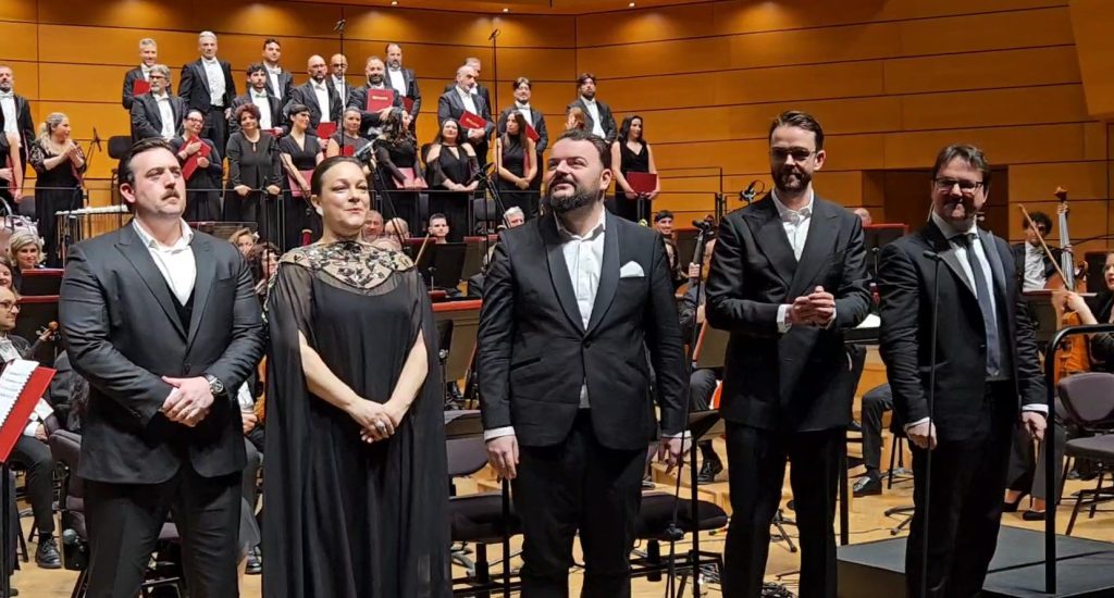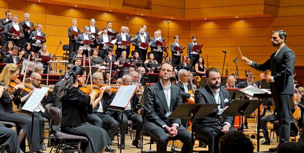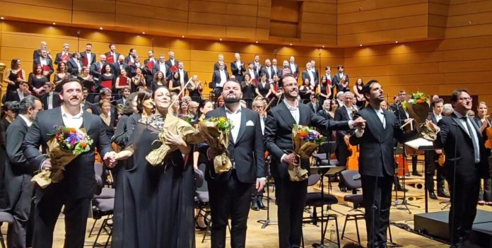L’imponente presenza del Coro del Petruzzelli di Bari, preparato da Marco Medved, introduce l’opera in una sorta di ouverture iniziale che anticipa la fiorente melodicità di una partitura che, pur nella durata contenuta di circa cinquantacinque minuti, si rivela ricca di splendide melodie. Melodie che nella replica sono apparse ancor più pregnanti rispetto all’esecuzione di giovedì, prima assoluta di questa riscoperta. Di eccellente livello le quattro voci protagoniste. Incisiva e solida in ogni registro il soprano lirico Eleonora Buratto; delicata, rotonda e morbida l’emissione del tenore Freddie De Tommaso; e di pari statura i due baritoni, Mihai Damian e Nicholas Mogg, entrambi profondi ed incisivi, chiamati a interventi tutt’altro che marginali affrontati con autorevolezza. Il Coro, di eccellente qualità e perfettamente integrato nella splendida orchestrazione, ha assunto un ruolo rilevante anche sul piano scenico. Il successo è stato caloroso, con applausi prolungati anche al termine delle splendide arie dei protagonisti. Omaggi floreali ai solisti, al direttore, al maestro del coro e al primo violino Fatlinda Thaci, hanno suggellato una serata che lascia auspicare, per quest’opera, una prossima realizzazione in forma scenica compiuta. Quasi dieci minuti gli applausi complessivi.