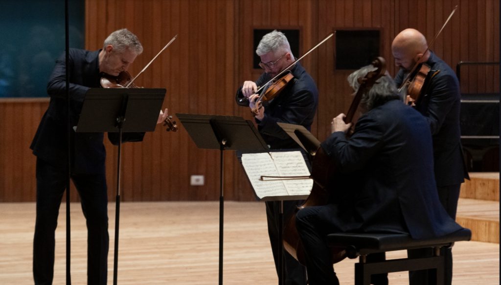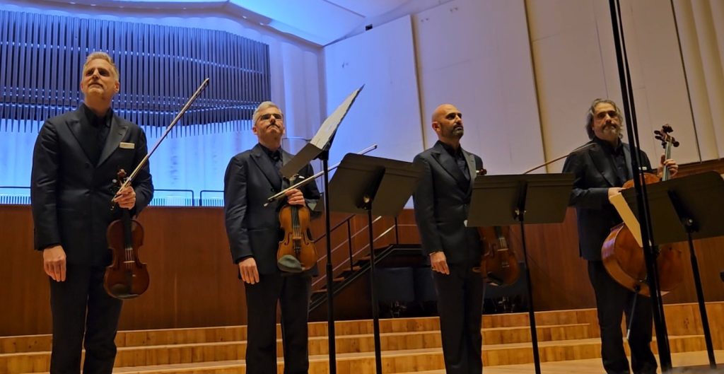La prima parte della serata era tutta per loro – Cristiano Gualco e Paolo Andreoli ai violini, Simone Gramaglia alla viola, Giovanni Scaglione al violoncello – impegnati in una delle vette assolute del repertorio quartettistico: il Quartetto in re minore D 810 “La morte e la fanciulla” di Franz Schubert. Nelle sue pagine più cupe e introspettive, l’opera mette a nudo la tensione tra disperazione e desiderio di consolazione, con il celebre Andante che varia il tema del Lied Der Tod und das Mädchen come un colloquio serrato tra la voce umana e la fatalità. Il Quartetto di Cremona, nella coesione perfetta dei quattro archi e con il suo equilibrio tra lucidità formale e intensità espressiva, si conferma interprete ideale di questa celebre partitura.