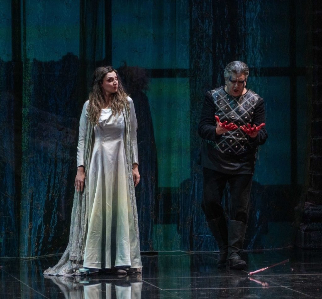 Al netto dall’encomiabile prova di professionalità, data nell’accettare immediatamente l’incarico di sostituire la più titolata Zanettin, il giovane soprano pugliese deve, con ogni evidenza, ancora crescere e maturare, e in questo momento il ruolo di Lady Macbeth, tra i ruoli sopranili più ardui, non è per lei. Volendo partire dal meglio che si può dire della sua vocalità, Bellantuono dispone di discreta potenza nella spinta verso l’acuto, e di un fiato abbastanza lungo per sostenere il fraseggio. Detto questo, vengono le dolenti note: una voce povera di armonici, debole in tutti registri-chiave dell’estensione, i gravi e i centri, fragili, e gli acuti, quasi sempre strillati. Ma l’aspetto che la Bellantuono, a nostro avviso, deve correggere il più presto possibile è la dizione, che soprattutto nelle sezioni cantate è assai imperfetta, rendendo spesso poco comprensibili le sue parole. Possiamo giudicare sufficiente la sua interpretazione attoriale, grazie anche alla regia di Piscopo, soprattutto nella grande scena di follia. Il meglio, dal punto di vista vocale, è stato offerto dai personaggi ‘minori’, eppure importantissimi nello svolgimento della vicenda e nella sua architettura musicale. Per noi il migliore cantante in assoluto di questo Macbeth è stato Roberto Scandiuzzi:basso verdiano tra i più grandi della sua generazione (n.1958), ha sfoggiato una voce dal bel timbro scuro, nobile, che, unito ad una linea di canto di buona tenuta e ampio respiro, sostiene, anche scenicamente, un’eccellente interpretazione della parte di Banco, dalla intensa tragicità, venata di severa maestosità, che si riflettono anche nella sua presenza scenica. Solida la prova del tenoreIvan Magrì, nel ruolo di Macduff, sorretta da uno strumento vocale chiaro e di buona proiezione, e improntato ad un’espressività drammatica di forte impatto: il suo momento migliore è stata l’aria “Ah, la paterna mano” (Atto IV) di bel fraseggio e coinvolgente emotività, con un crescendo verso l’acuto di grande suggestione emotiva. Il giovane tenore cinese Xiaosen Su, un Malcolmdalla linea di canto pulita e dal timbro chiaro e sempre controllato con eleganza, anche nei più vivaci concertati, è apparso un po’frenato sul piano attoriale, ma è apparso comunque come un cantante destinato a traguardi di tutto rispetto. Hanno nel complesso sbrigato adeguatamente il loro compito le parti di fianco: Elena Malakhovskaya (Dama di Lady Macbeth), Marco Baldino (Re Duncano), Omar Cepparolli (Medico), Piero Santi (Domestico/Araldo), Luigi Varriale (Sicario), Roberto Messina,Erika Fornero, Agnese Jurkovska (Prima, seconda, terzaapparizione, cioè le streghe).