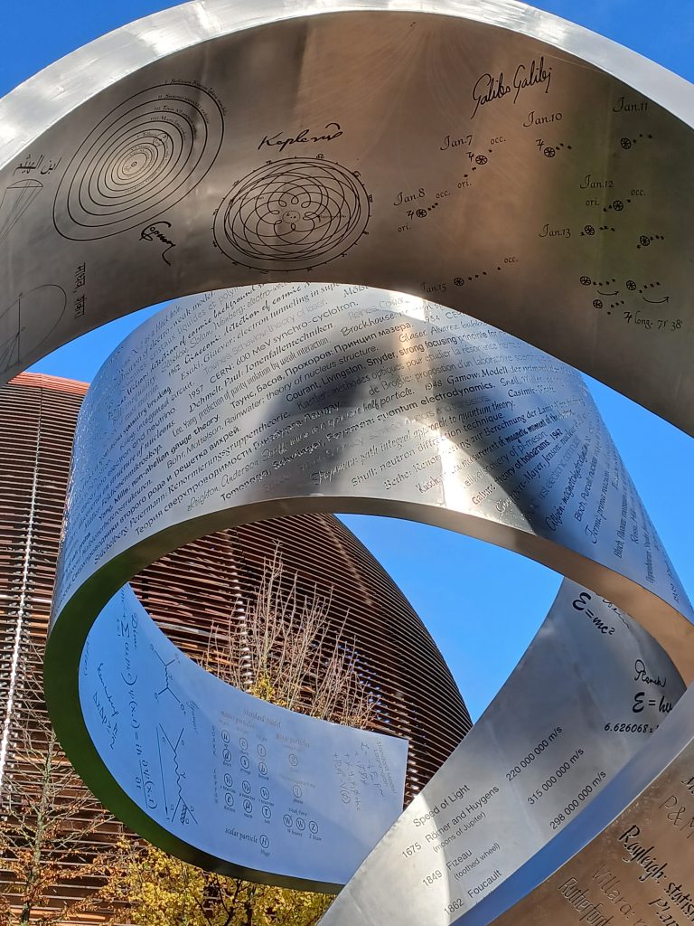 Un interessante monumento d’acciaio all’ingresso, tra il Globe e il Gateway, è Wandering the immeasurable (2014), ossia “Vagando nell’incommensurabile”, dell’artista canadese Gayle Hermick, a forma di grande nastro alto 7 metri. Porta incisi molti nomi, formule, grafici, e omaggia le grandi scoperte della Fisica. La Hermick decise di dedicare la sua arte a quest’opera dopo che una sua visita al centro, nel 2005, l’aveva fortemente colpita e affascinata. Copernico e Keplero sono abbinati a disegni che rappresentano il modello eliocentrico del sistema solare e le leggi del moto planetario; Galileo ha accanto al nome la rappresentazione delle sue osservazioni dei pianeti al telescopio. Ed ecco anche le prove di misurazione della velocità della luce, le equazioni di Planck e di Einstein, date e tappe fondamentali dal calcolo sessagesimale in Mesopotamia fino alla scoperta del bosone di Higgs al CERN: un vero riassunto di storia della Fisica!