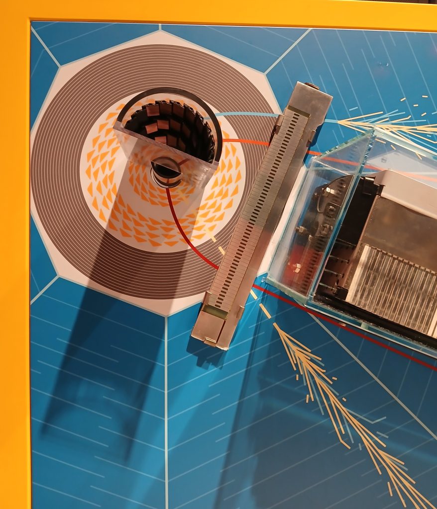 Si introduce il visitatore allo studio delle particelle effettuato tramite collisioni negli acceleratori, che producono sciami di nuove particelle, identificate tramite rivelatori. Questi possono riconoscerne le tracce e trovare la loro traiettoria, curvata in modi diversi da magneti; i giganteschi calorimetri elettromagnetici, attraversati dalle particelle, forniscono informazioni sulla loro energia.