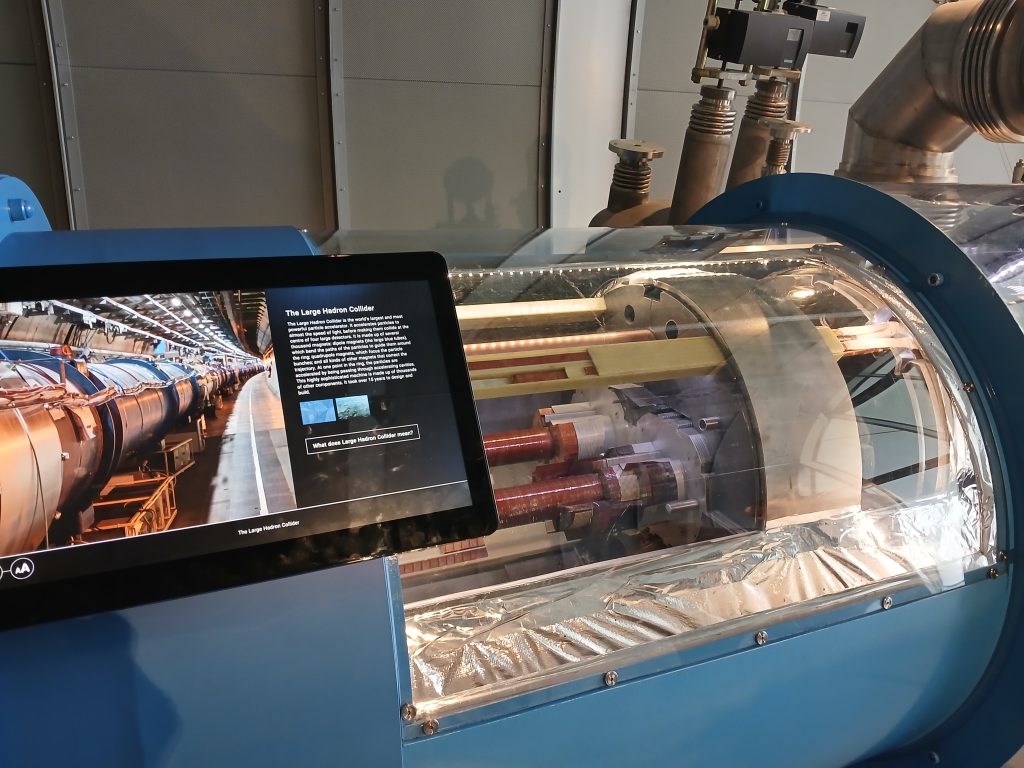 Si osservano strumenti e oggetti utilizzati e si intuisce l’enorme importanza delle scoperte effettuate, che hanno condotto negli anni ‘80 all’invenzione del World Wide Web (la “ragnatela” mondiale di documenti collegati, accessibili tramite Internet); grandi contributi sono stati dati anche in campo medico, per la radioterapia e per metodi diagnostici avanzati. Si osserva anche, al di là di una vetrata, la sala di controllo dell’LHC (vedi sotto).