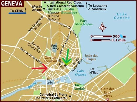 Una volta effettuata la registrazione sul sito del CERN, si può prenotare il viaggio a Ginevra: una soluzione economica (poco più di 50 euro A/R) per chi abita a Milano è senz’altro il Flixbus, che parte da Lampugnano (davanti all’uscita della M1) e impiega mediamente 6-7 ore per arrivare, con una breve tappa ad Aosta. Partendo alle 14:05, per esempio, si è giunti a Ginevra alle 20:30 circa, a causa di un notevole traffico e code conseguenti; il ritorno, alle 17:35 del giorno seguente, si è svolto più rapidamente (arrivo alle 23:20). La fermata ginevrina del Flixbus è in Place Dorcière (freccia verde sulla mappa), in centro, vicino alla stazione ferroviaria Cornavin.
