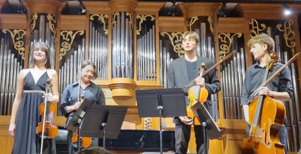 Oggi, Sabato 15 novembre, l’Auditorium del Conservatorio Cantelli di Novara ha ospitato, per la nuova stagione dei Sabati, la pianista giapponese Yura Okawa nella prima parte del concerto e un Quartetto d’archi di giovani promesse del Cantelli, nella seconda parte. Di Yura Okawa abbiamo già scritto in occasione del suo recente recital nell’ambito del Festival pianistico Pianovara, a settembre. Poiché la Okawa ha presentato ieri quasi lo stesso programma di quel recital, ci permettiamo di rimandare alla nostra recensione su questo giornale, dell’11/09/2025. L’unica novità era rappresentata dallo Scherzo n.3 op.39 in do diesis minore di F. Chopin. In questo non facile pezzo, la giovane allieva giapponese, venuta a perfezionarsi a Novara col Maestro Coppola, ha confermato una volta di più le virtù del suo stile pianistico: un bel suono pulito, chiaro ed energico, nelle potenti doppie ottave del tema d’apertura, al netto di qualche imprecisione su qualche nota, lasciando peraltro un po’ a desiderare nel tema di corale successivo, suonato a nostro avviso, con una linea espressiva un po’ opaca, appiattita su un suono ‘pestato’ e dinamiche un po’ povere: il tema di corale ne è risultato impoverito in quel che ha di più affascinante, quella dolce, eterea pacatezza che lo contrappone all’infernale” tema introduttivo. Ammirevoli invece le rapide cascate di note che intercalano il corale, di cui la Okawa pone in risalto, con l’uso del pedale di risonanza, il valore soprattutto timbrico.